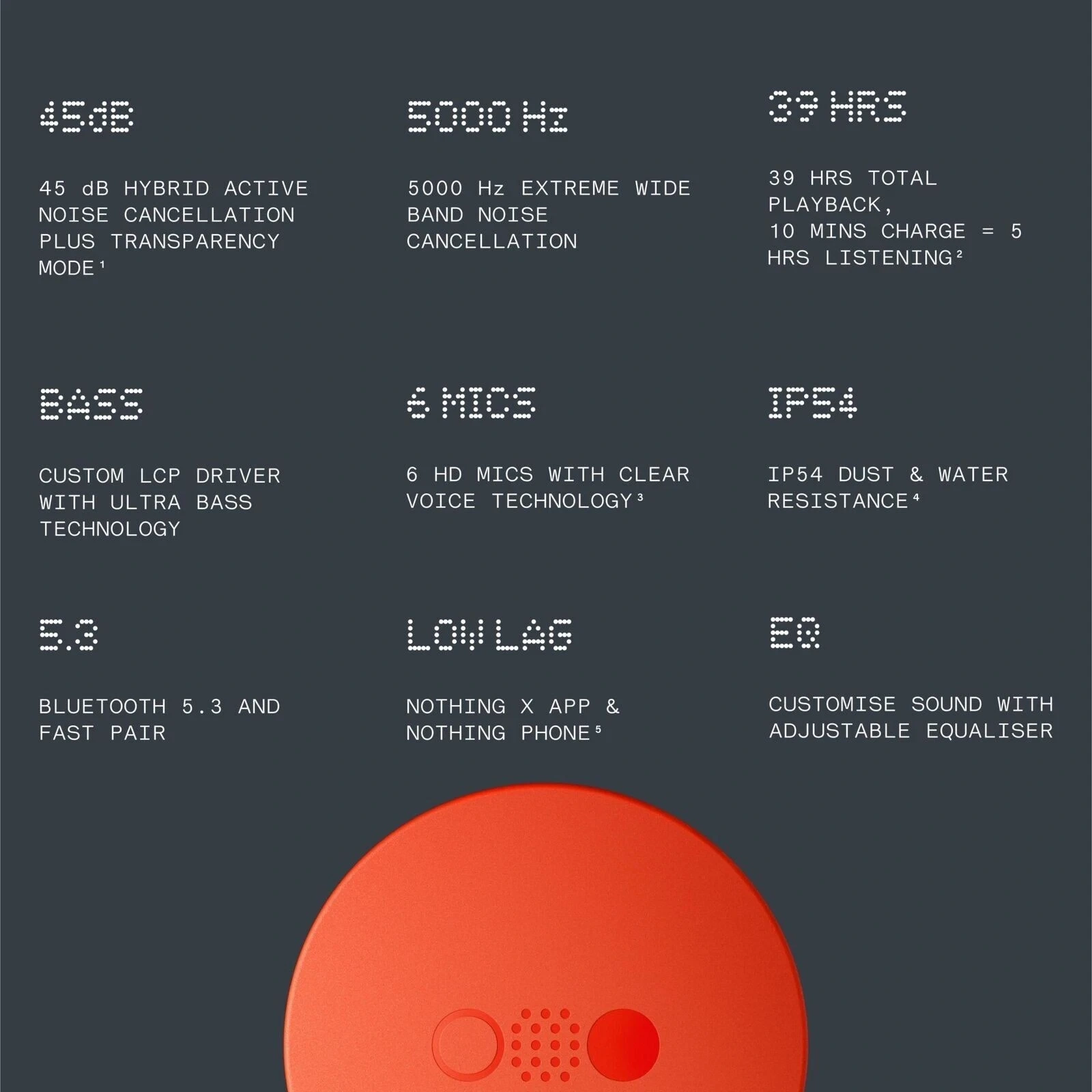 Silence meets power. Silence the distractions. CMF Buds Pro takes 45 dB active noise reduction to another level with a bandwidth of up to 5000 Hz. With a wider frequency range, more types of noises can be eliminated. So even on busy commutes and in noisy office spaces, you can fully immerse yourself in your favorite audio. We built Buds Pro with a special wind-through structure that features two holes at the top of the stem. Combined with advanced wind noise reducing algorithms delivering uninterrupted conversations and immersive music experience. With 6 HD microphones and Clear Voice Technology that’s been trained on 20,000,000+ noise models, enjoy the phone calls with next-level clarity. All about the bass. We developed CMF Buds Pro to transform the bass experience by ensuring hardware and software work together to enhance sound in real-time. Starting with hardware, the custom 10 mm driver features a premium LCP + PU diaphragm for high elasticity and more precision. The soft material of the PU is what allows the bass sound to come through purer and more accurate. We also gave the rear chamber an exhaust vent to make the mid-low frequencies fuller, the high frequencies clearer and low frequencies extra powerful. CMF Buds Pro features an intelligent bass enhancement algorithm that enhances the sound of bass in real-time. It detects music signals as you’re listening and presents a clearer bass effect. You can customise sound yourself too with the Nothing X app. Just connect your CMF Buds Pro and use the Equaliser to adjust the sound of bass and treble. We designed CMF Buds Pro to support you throughout the entire day. Enjoy 11 hours of non-stop music playback on a single charge or extend your listening time to up to 39 hours by using the earbuds with the charging case (with ANC is turned off). Compatible with Fast Charge for quick and seamless power-ups. Get 5 hours of listening after just 10 minutes of charging.